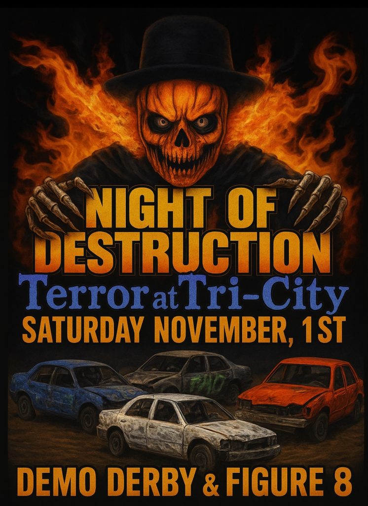 Saturday, Nov 1 – “Night of Destruction Terror At Tri City”/Biggest Trunk or Treat – Figure 8 Races, Demo Derby, Auto Soccer/Jeep Club/Adult Barbie Power Wheels Downhill & Kids Power Wheels Races – TEAR DOWN OF THE TRI CITY SPEEDWAY TOWER