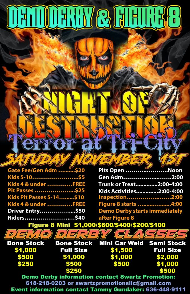Saturday, Nov 1 – Demo Derby & Figure 8 “Night of Destruction Terror At Tri City”/Biggest Trunk or Treat – Jeep Club Halloween Festival