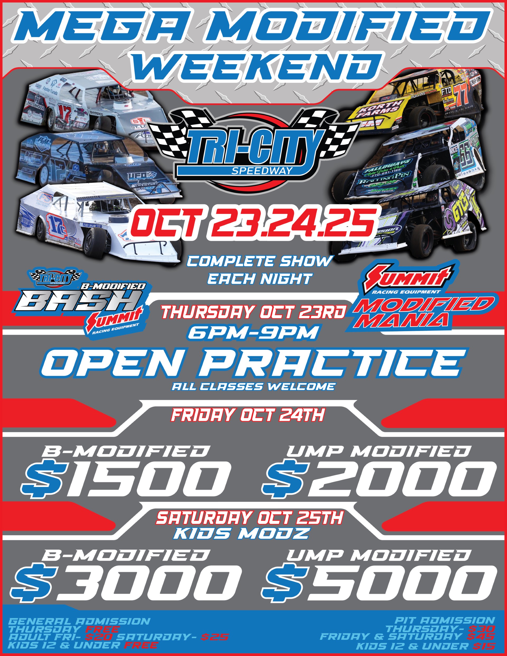 Saturday, Oct 25th – BMods $3,000/UMP Modifieds $5,000/Crown Vics/Kids Mods “Trunk or Treat in the Pits 2:00 – 4:00 / FREE to the Public bring the whole family”